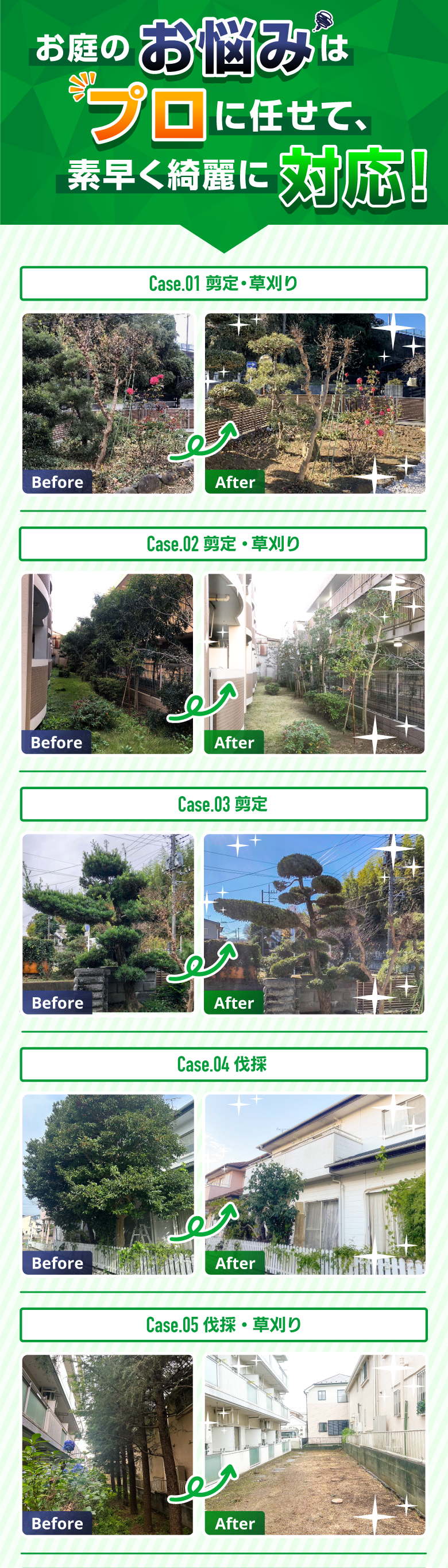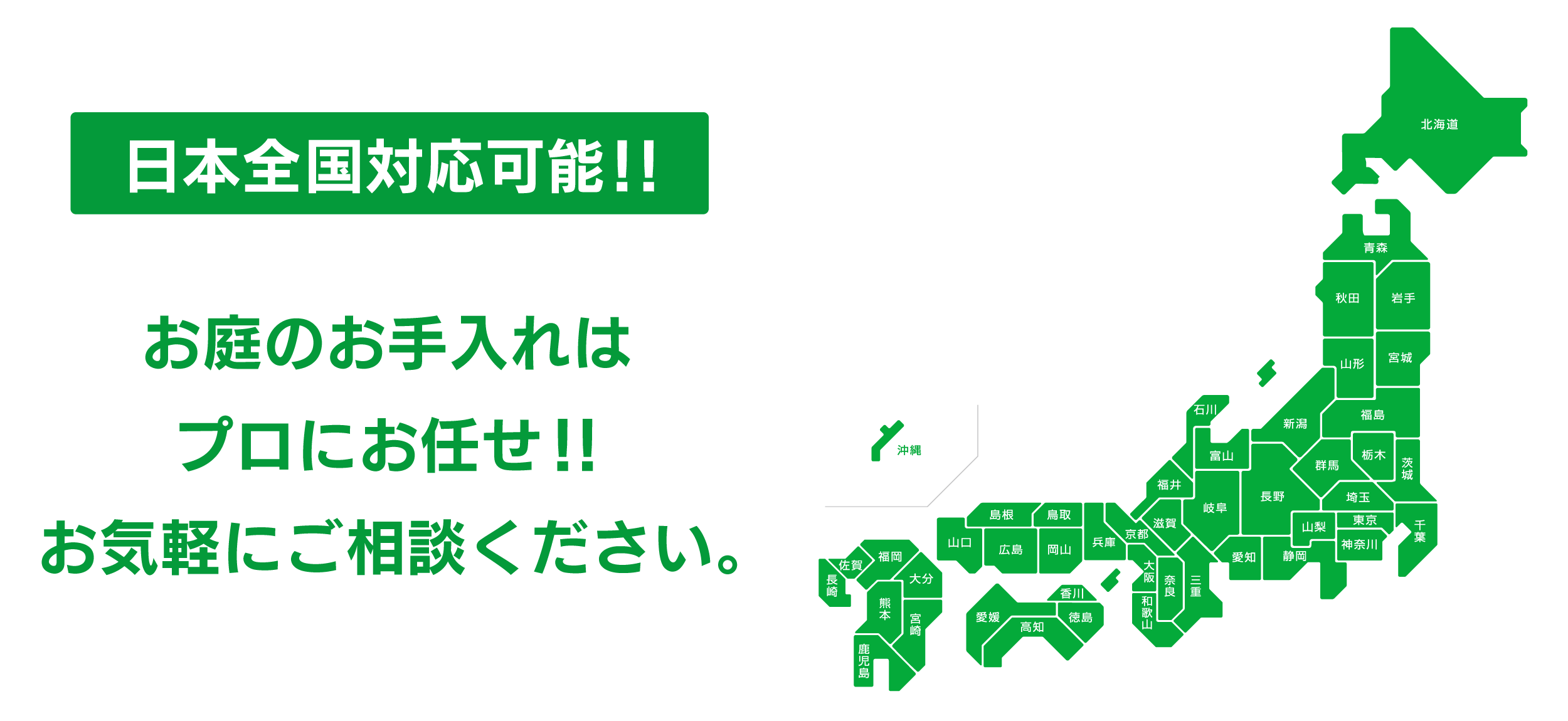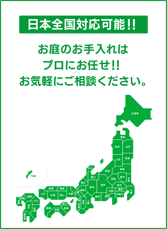 - A事前にご相談をいただければ、予算の範囲内でお庭の手入れをする事が可能です。お庭の一部は自分で手入れをされ、残った高所作業や難しい作業を弊社に依頼するという事も可能ですので、お気軽にお問い合わせください。