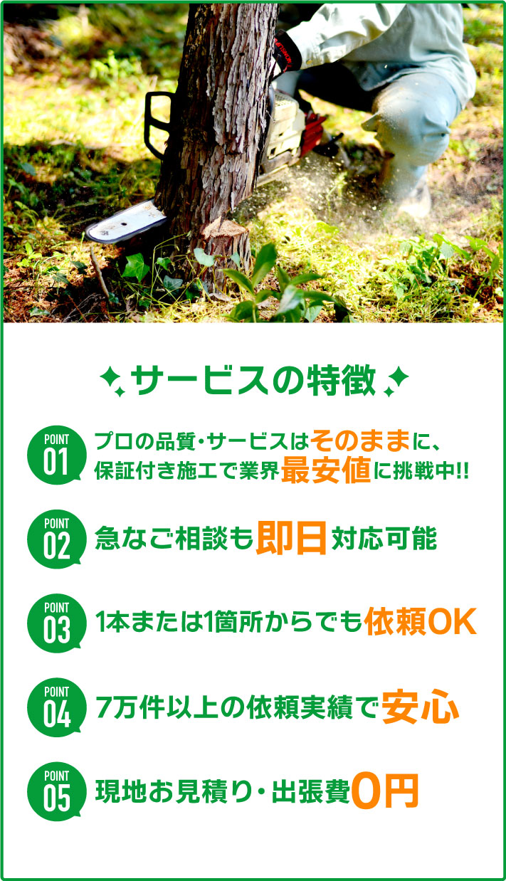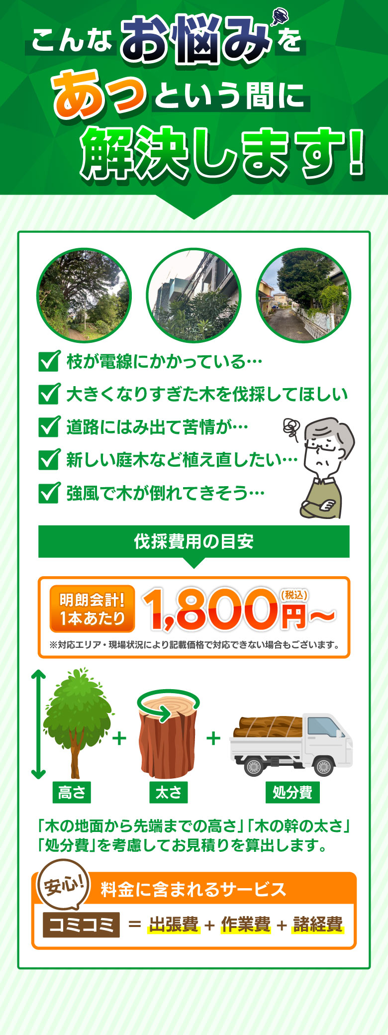 今回、庭の大きな木の伐採をお願いしました。正直、費用や作業時間がどれくらいかかるのか不安でしたが、見積もりから当日の作業までとても丁寧で安心できました。