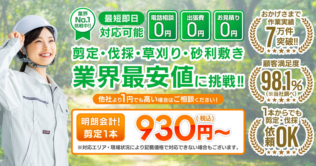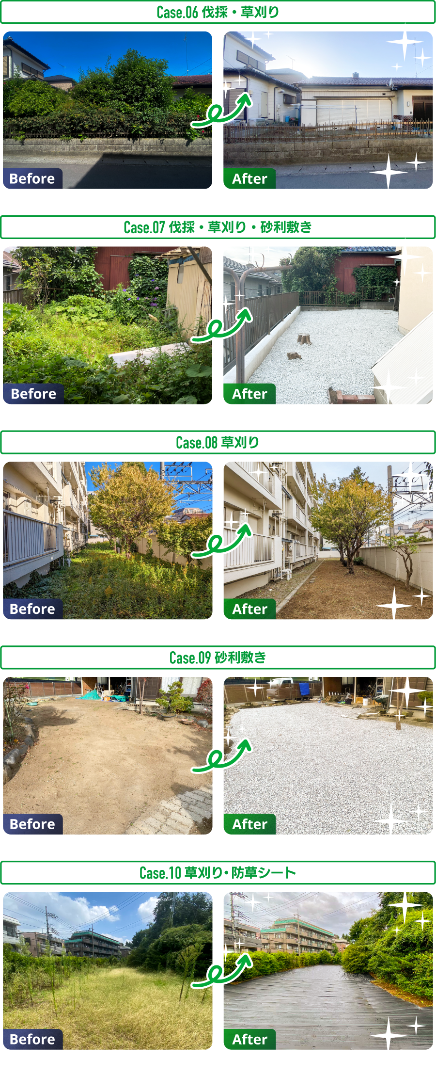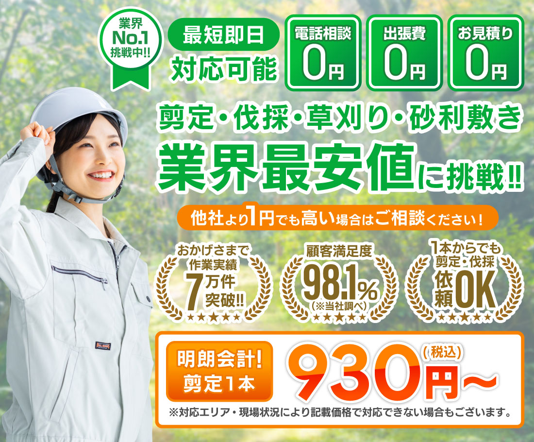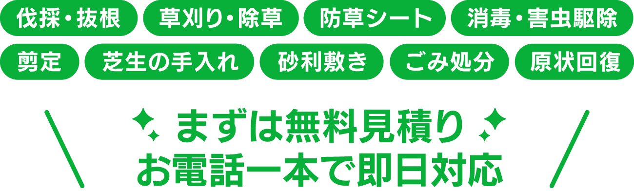 - A伐採・枝落とし・剪定・草刈り・砂利敷き、なんでもご相談ください。お客様の理想の仕上がりがどのようなものかお伺いし、ご提案もさせていただいております。消毒作業が必要なのかも含め、まずは現地調査にてお見積りを出させていただきます。