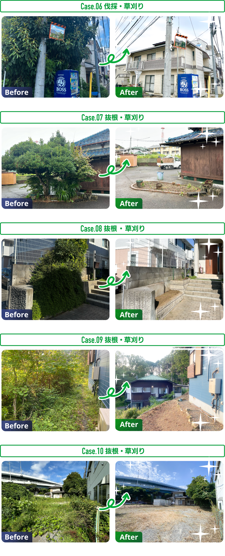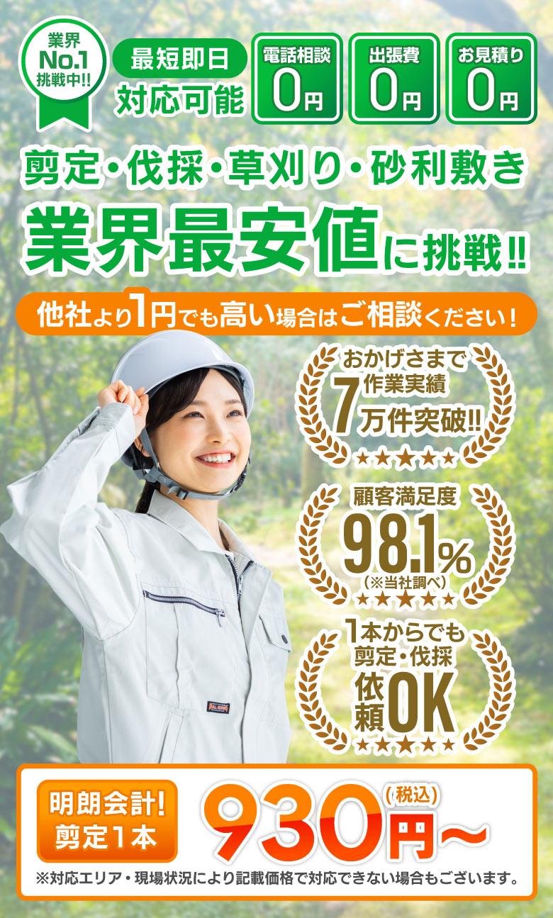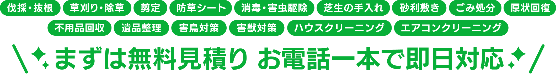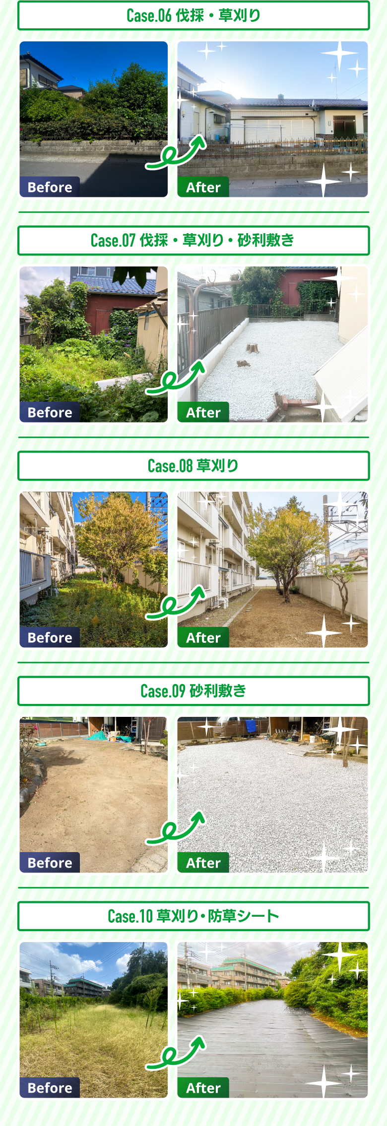 - A伐採・枝落とし・剪定・草刈り・砂利敷き、なんでもご相談ください。お客様の理想の仕上がりがどのようなものかお伺いし、ご提案もさせていただいております。消毒作業が必要なのかも含め、まずは現地調査にてお見積りを出させていただきます。